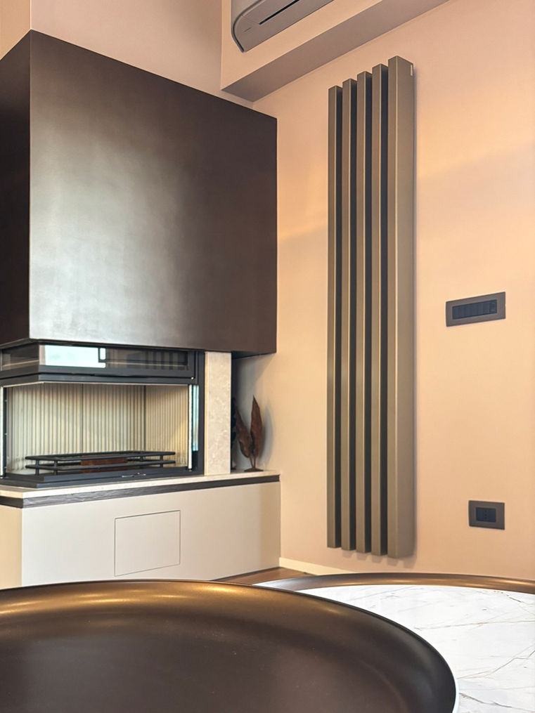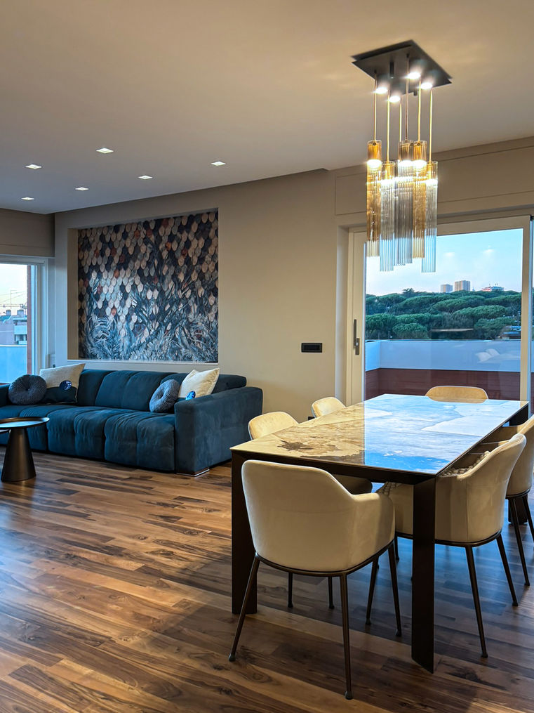 Questo progetto di interior design si distingue per la sua raffinata palette di colori, che spazia dal beige caldo e dal marrone terroso ai toni del celeste e del blu, creando un'atmosfera accogliente e naturale. Questi toni neutri sono sapientemente contrapposti da accenti di blu, che aggiungono un tocco di freschezza e modernità agli spazi. Questa combinazione non solo valorizza l’estetica degli ambienti, ma favorisce anche un senso di armonia e benessere. Ogni elemento è pensato per creare un'esperienza visiva unica e coinvolgente.